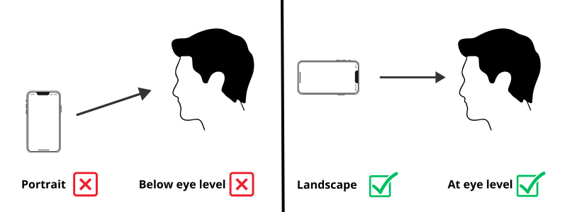 • Ensure the camera portion of your device is at eye level (see example). You can use a tripod built for a smartphone or tablet. If you do not have a tripod, consider using a stack of books on a desk or box. Filming in “landscape” (horizontally) is recommended.