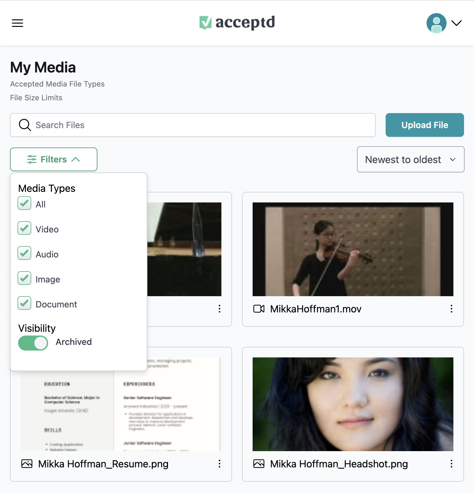 Media has always been at the center of the application process on Acceptd. We know that for artists, being able to seamlessly upload, review, and manage your media is an important part of putting your best foot forward, and that's why we're excited to announce an updated experience for My Media, available today for all users.